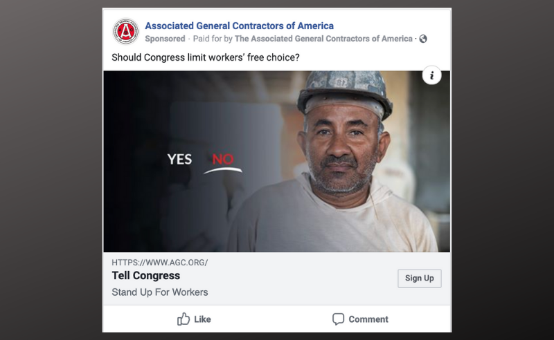From February 2-6, the Construction Advocacy Fund financed an AGC effort to engage a construction-friendly audience on Facebook through the placement of digital ads in the lead up to a vote in the U.S. House of Representatives on the Protecting the Right to Organize (PRO) Act. The ads were run in the following congressional districts where members of Congress were undecided on the legislation: AK-AL, CA-16, CA-48, CA-52, FL-7, FL-18, FL-25, NY-1, NY-24, OK-5, and SC-1. The ads, which were seen by over 600,000 Facebook users, urged individuals to tell their representative to oppose the bill.